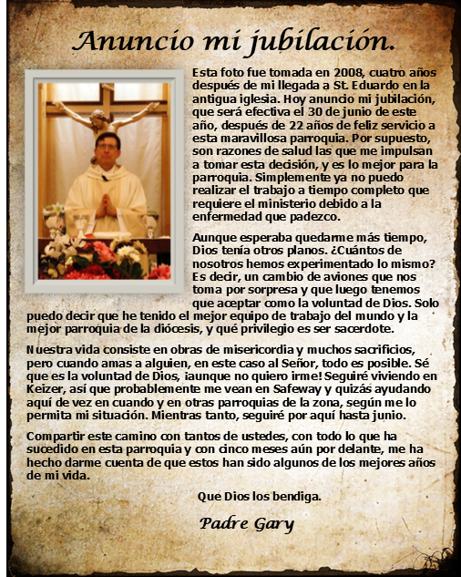 Mi vocación ha tenido muchos giros y vueltas. Sentí el llamado a ser sacerdote en la escuela secundaria, y después de asistir a la Universidad Loyola Marymount en Los Ángeles, donde estuve muy activo en la Renovación Carismática y trabajé como empleado en las Bibliotecas de la Ciudad de Los Ángeles, sentí el llamado a probar con los Benedictinos en el Priorato de San Andrés (ahora Abadía) en Valyermo. Después de esto, el Señor me llevó a una carrera con American Airlines, donde tuve la bendición de trabajar durante más de 10 años como agente en varias capacidades. Además de ser bendecido con muchas oportunidades de viajar, mi trabajo favorito allí fue tratar con personas en el área de equipaje perdido ("ministerio de equipaje perdido"), donde se obtuvieron muchas ideas sobre la vida y las personas en general. Después de muchas señales y mucho discernimiento, tomé el riesgo de dejar mi primera carrera y entré en el Seminario Mount Angel en 1991, siendo ordenado para la Arquidiócesis de Portland en 1997. Estoy agradecido al Señor por la gracia de ser sacerdote para el pueblo de Dios.